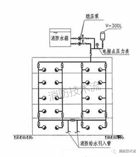 高位消防水箱的主要作用是供給建筑初期火災時的消防用水水量,當消防水滅火系統例如室內消火栓系統的穩壓裝置設置在高位時,因高位消防水箱經過穩壓裝置與消防管網連接,容易漏設高位水箱的并聯重力出水管(如下圖)。