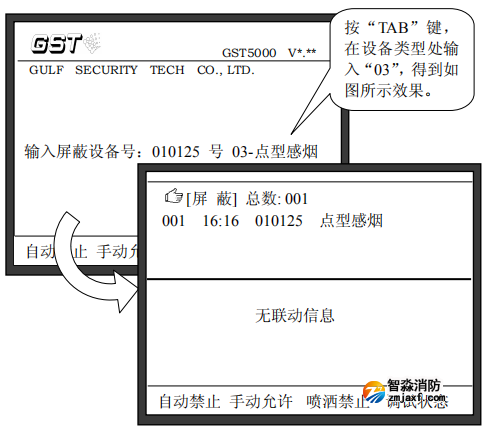注意:在進(jìn)行消防主機(jī)“屏蔽”操作中輸入設(shè)備的編碼時,可以使用通配符“*”,“*”代表這一位可以是0~9中的任意一個數(shù)字,這個功能可以方便的將一類設(shè)備取消屏蔽。例如:如果要屏蔽掉系統(tǒng)中所有的點型感煙火災(zāi)探測器,我們可以在屏蔽操作時輸入:“******”,“TAB”,“03”,這樣所有點型感煙火災(zāi)探測器將被屏蔽。其中“03”為點型感煙火災(zāi)探測器設(shè)備類型代碼。